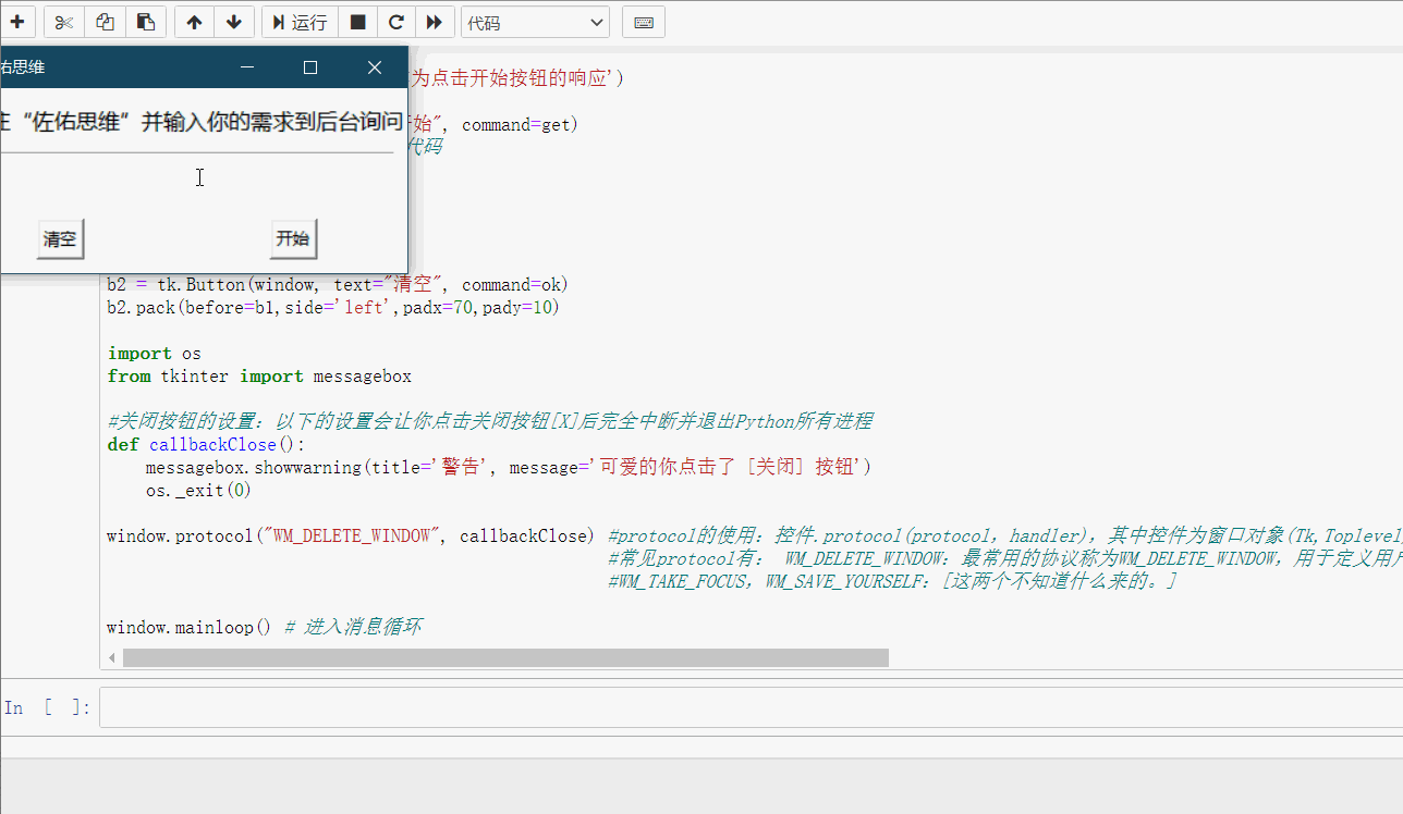 window.protocol("WM_DELETE_WINDOW", callbackClose) #protocol的使用:控件.protocol(protocol,handler),其中控件为窗口对象(Tk,Toplevel)